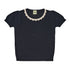 Dieses gestrickte T-Shirt aus Bio-Baumwolle hat kurze Ärmel, ein gestricktes Spitzendetail mit Kontrastfarbe am Halsausschnitt und gerippte Säume. Dieses T-Shirt hat eine normale Passform, die Ärmel haben oben kleine Raffungen, der Körper und die Ärmel sind in feinem Pointelle-Muster gestrickt.