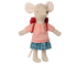 Die große Schwester Maus ist für einen Tag im Kindergarten oder in der Schule angezogen und trägt ihren Rucksack auf dem Rücken. Sie hat Magnete in ihren Händen, damit sie die Griffe des Dreirads für eine schnelle Fahrt halten kann.