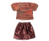 Das Set besteht aus einer mehrfarbigen Strickbluse und einem Rock in glänzenden rosa Farben.