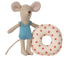 Dieses Sommerset besteht aus einer kleinen Schwester Maus, die in einen blauen Badeanzug gekleidet ist und einen rot gepunktete Schwimmring um den Bauch trägt. Jetzt ist sie bereit für sicheres Schwimmen im Meer.