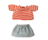 Der weiche Strickpullover mit roten Streifen wird mit einem Rock kombiniert.